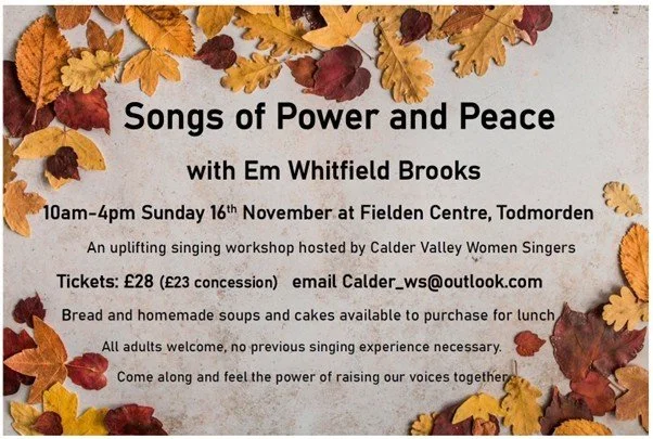 I’m really looking forward to leading this , a one-day workshop hosted by the lovely Calder Valley Women Singers. All genders are very welcome!